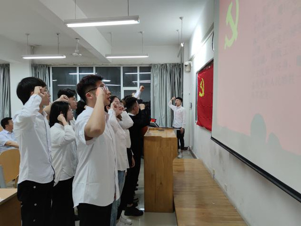 会议伊始,程晓珊同志,报告了出席大会的党员以及预备党员人数,宣布大会有效。随后,会议按照党组织接受预备党员程序进行。庄光耀等22名发展对象同志依次宣读《入党志愿书》,向大会汇报自己对党的认识、入党动机、现实表现,介绍本人履历、家庭主要成员和主要社会关系等。入党介绍人分别介绍发展对象有关情况,支部书记代表支部委员会报告发展对象审查情况。随后通过会议讨论无记名投票,大会一致同意接收庄光耀等22名发展对象为中共预备党员。接着,22预备党员同志面向党旗进行庄严宣誓。