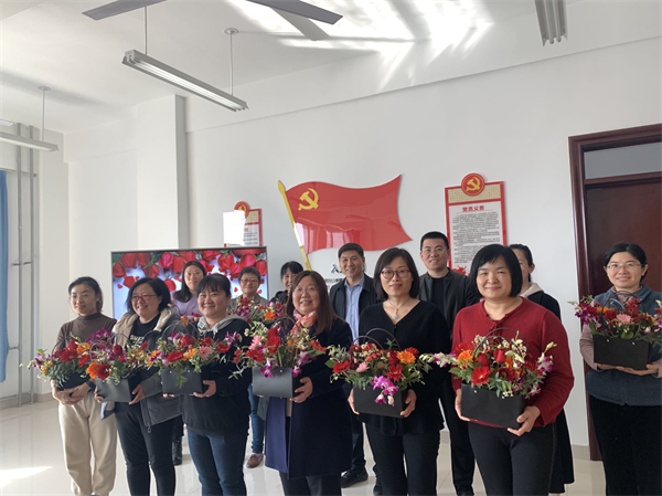活动开始,学院党总支书记刘廷明向全体女教职工致以节日的问候和美好的祝福,鼓励大家要爱美、爱生活、爱自己,激励大家今后要继续发挥巾帼智慧。随后,拥有多年插花经验的花艺老师细致地给大家讲授选花、裁剪、颜色搭配、造型等方面的插花技巧,讲解各种花所蕴含的花语和祝福。活动现场气氛温馨,平时忙于工作和家务的老师们全身心投入到活动中,大家认真聆听的同时,不时地跟花艺老师探讨,积极主动地构思自己的作品,用心制作着属于自己的花篮,在花艺老师的指导与帮助下,大家顺利完成了自己的作品。花艺老师对大家的作品进行一一点评,并邀请优秀作品创作者分享创作灵感,老师们踊跃发言。整个活动过程气氛高涨,井然有序。最后,大家合影留念,插花活动圆满顺利完成。