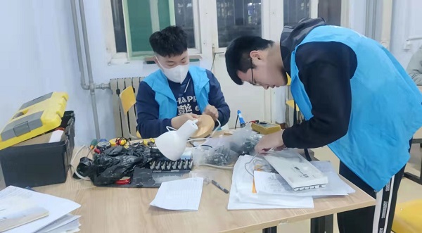 面对这一问题,滨州学院电气工程学院“E来电”助修站立即采取了相应的措施,依托专业特色,面向全校师生开展电器义务维修(学生宿舍允许使用范围内)志愿服务工作。“E来电”发出宣传号召后,成员纷纷响应、迅速动员,开展线上报名、线下维修,在每栋公寓楼设置待修电器收纳处,每天统一由工作人员收取待维修的电器,维修完后将统一进行消杀,并投放回各公寓楼收纳处。