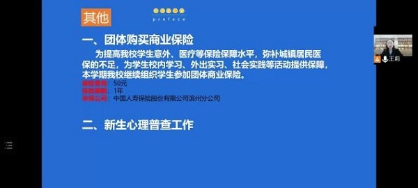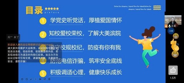 会议由赵建斌老师和王莉老师主持,主要讲了疫情防控教育、网络文明与网络安全教育、资助工作、商业保险报名工作、学生安全教育问题、违纪学生教育管理工作以及山东教育信息发布平台的介绍与讲解,切实把各项措施落实落细。首先,赵建斌老师向同学们详细传达了近期疫情最新动态和学校疫情防控部署安排。其次,强调了线上课堂纪律与相关注意事项,提醒同学们做好线上学习准备,自觉调整生活作息,课前做好充足准备,提高学习效率,以蓬勃向上的朝气,翻开新篇章。接着,赵建斌老师讲解意外保险,鼓励同学自由购买,并讲解我校学费收费标准,提醒未缴费的同学尽快缴费。随后强调疫情期间核酸检测具体方法为20个人为一组,提前扫码进行核酸检测,使得核酸检测更加快速、有序的进行。辅导员王莉老师就线上教学、日常生活、心理健康和纪律四个方面向同学们提出要求。在线上教学期间,同学们要提前预习,提前十分钟进入课堂,上课中认真听讲,对待学习不能有一丝懈怠。要求同学们不旷课不逃课,不得迟到早退,积极配合任课老师进行完成线上教学,保证一天高效地学习。会议最后,王莉老师重点强调防控疫情期间要持续保持良好的个人卫生习惯。坚持“非必要不外出”的原则,尽量减少出校,减少与校外人员接触。至此,会议圆满结束。
