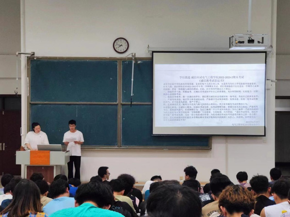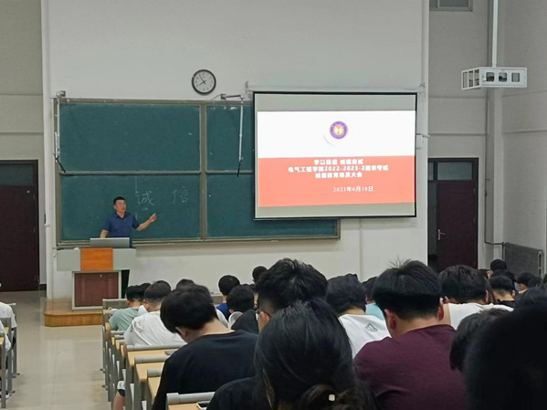 为树立学生诚信为本的道德观念,严肃考风考纪,营造积极向上的考试氛围,增强学生的诚信意识和责任意识,引导学生诚信考试、诚信做人。2023年6月18日,电气工程学院在8号教学楼305教室开展了考试诚信教育动员大会。会议由我院辅导员徐可主持,党总支副书记出席会议,2021级全体同学参加了此次会议。