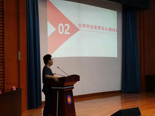赵建斌围绕“大学生心理健康概述”、“大学生常见心理问题”、“教你拥有健康心态”、“教你拥有健康身体”四个专题进行了讲解。赵建斌指出毕业生常见的心理健康问题以及不同问题的区分,阐明了心理健康的十条标准。他强调,人的成长并不仅凭智力因素,一个人即使智力条件并不优越,但如果具备了健康的心理,培养了良好的心理素质,不懈地努力奋斗,并注意加强自身的修养,成功机会就可能比别人多。
