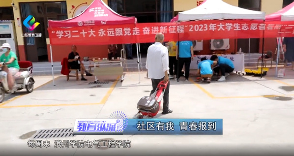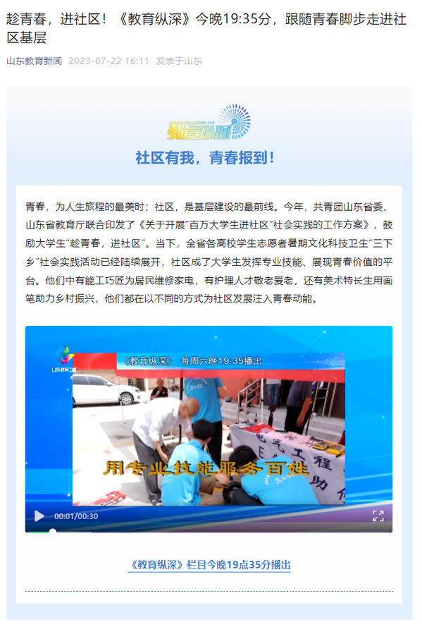 7月22日,山东教育卫视《教育纵深》栏目播出“社区有我 青春报到”大学生暑期“三下乡”实践活动记录片,“E来电助修站”团队的志愿服务活动纪实被首先播出。