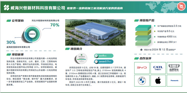 威海兴恒新材料科技有限公司,成立于2023年,是由威海环翠区政府招商引资成立的省重点高新技术企业。公司由河北兴恒新材料科技有限公司和魏桥威海宏信新材料有限公司强强联合、共同投资建设,其中河北兴恒占比70%,威海宏信占比30%。